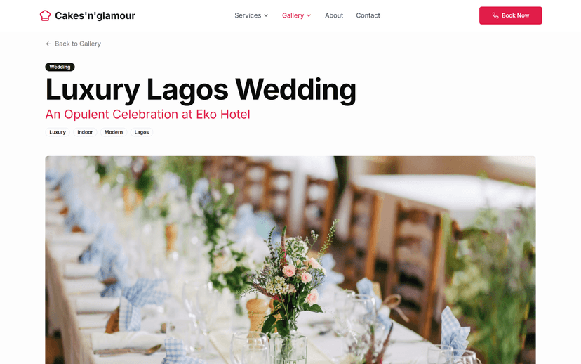 Cakes N Glamour is a beautifully crafted website showcasing custom cake designs and event dessert services, featuring a portfolio of work, service highlights, client testimonials, and options for clients to book consultations and explore offerings. Designed to elevate the online presence of a creative cake business and attract new customers with visual appeal and seamless navigation.